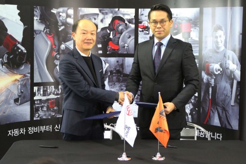 ▲ 시카고 뉴매틱 코리아 서동현 상무(왼쪽)와 CJ E&M 모터스포츠 팀의 이정웅 감독(오른쪽)이 정비 공구 후원 계약서 체결 후 기념 촬영을 하고 있다